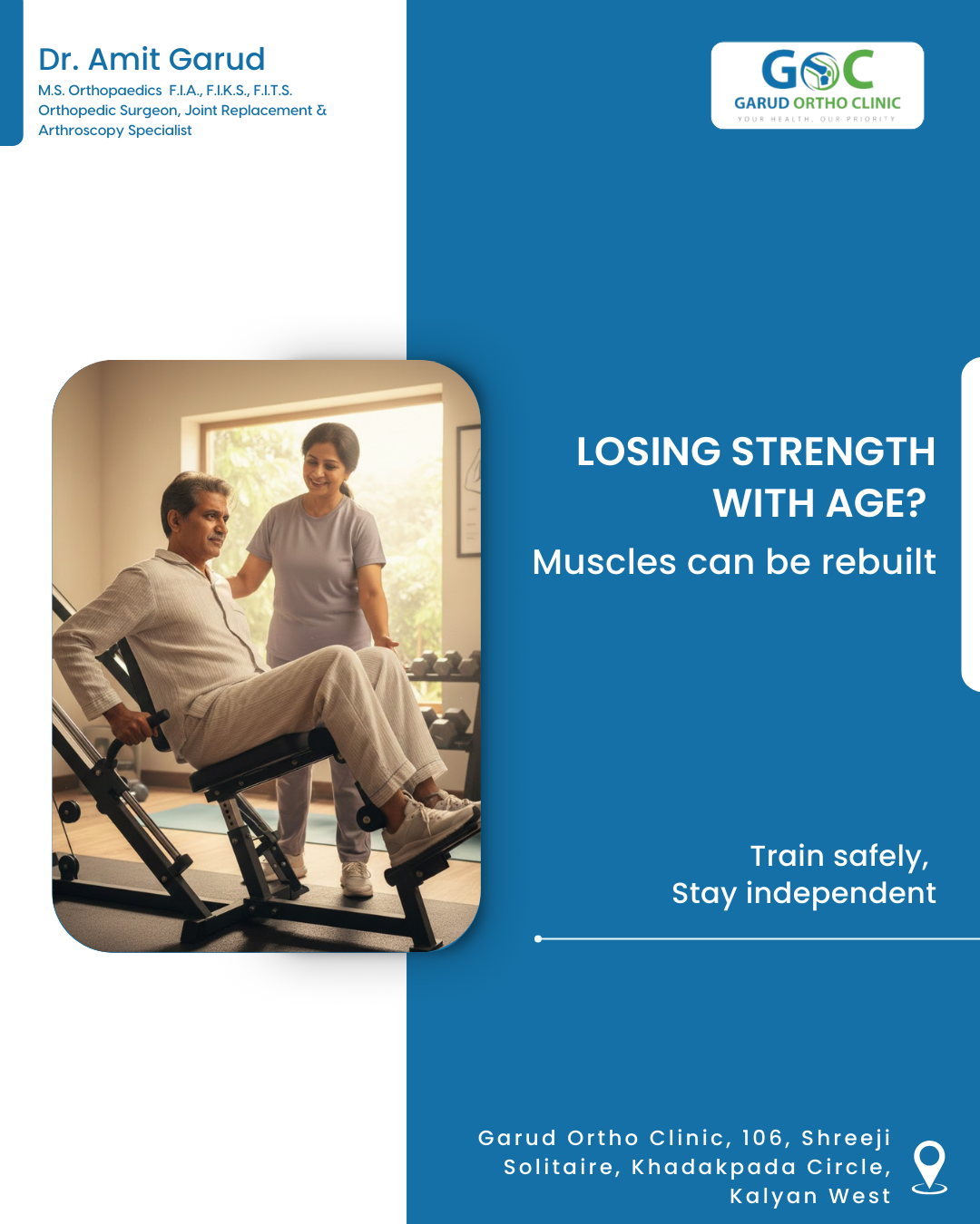 Bone Specialist and Orthopedic, Arthroscopy & Joint Replacement Surgeon in Kalyan, Dr Amit Garud, explains that musclestrengthening exercises are essential for healthy ageing. With age, muscle mass naturally declines—a condition known as sarcopenia—which increases the risk of falls and fractures. Resistance training using light weights, resistance bands, or simple bodyweight exercises helps: · Rebuild muscle strength · Improve balance and posture · Enhance joint stability · Support bone density · Boost metabolism and energy levels Regular strengthening exercises also help manage chronic conditions like arthritis and diabetes. Elderly individuals should consult a healthcare professional to begin safe, personalised routines.