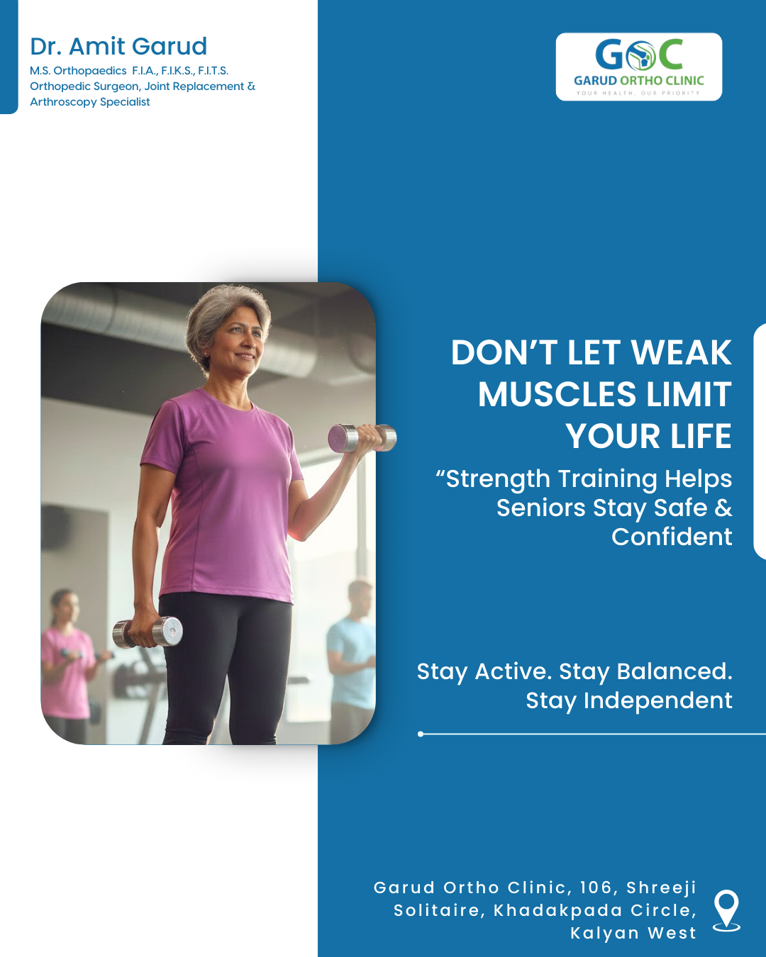 After age 60, adults lose 3–5% muscle mass per decade, increasing the risk of falls, fractures, and reduced independence (Source: Journal of Aging Research). The good news — guided strength training can help slow this decline. At Garud Ortho Clinic, Kalyan, Dr. Amit Garud highlights the importance of supervised muscle training to support strength, balance, and overall mobility in seniors. Benefits of muscle training for seniors: • Better balance and fall prevention • Improved bone density and reduced fracture risk • Enhanced joint support for arthritic conditions • Greater independence in daily activities • Support for chronic condition management • Improved mood and cognitive function • Healthier metabolism and energy levels Safe, structured approach: Dr. Amit Garud designs age‑appropriate, low‑impact resistance programs tailored to each individual’s health status, past injuries, and fitness level — ensuring safety while building strength. Muscle weakness accelerates ageing and affects quality of life. Supervised training helps seniors stay active, confident, and independent for longer. Visit Garud Ortho Clinic for patient‑focused senior fitness programs and expert orthopaedic guidance.