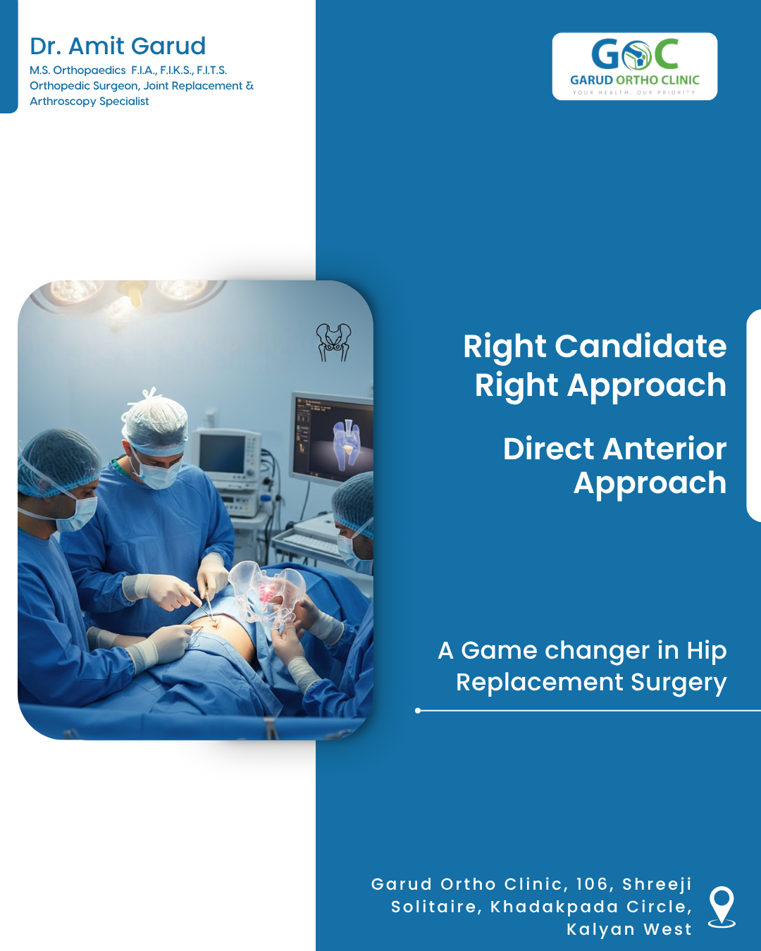 Who Is the Right Candidate for Direct Anterior Approach Hip Replacement? Wondering if DAA hip replacement is right for you? Dr. Amit Garud, the only surgeon in Kalyan and among the few in Mumbai internationally trained in this advanced technique, explains who benefits most. DAA is ideal for patients seeking a minimally invasive option with quicker recovery and less pain. Dr. Amit Garud has successfully performed this surgery on many patients, helping them regain independence and mobility. You May Be a Good Candidate If You Have: • Severe hip arthritis or cartilage loss • Persistent hip pain affecting mobility • Stiffness and difficulty performing daily tasks • No relief from medicines, physiotherapy or injections With detailed evaluation of bone structure, lifestyle and overall health, Dr. Amit Garud ensures each patient receives the most suitable treatment for longterm relief.