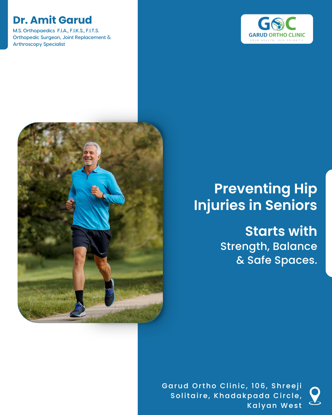 How to Prevent Hip Injuries in Elderly People Hip injuries in older adults can be serious, often leading to long recovery periods or even the need for surgery. Dr. Amit Garud, the only surgeon in Kalyan and among the few in Mumbai internationally trained in Direct Anterior Approach (DAA) hip replacement, shares essential ways to protect the hips as we age. As bone strength reduces and balance becomes less stable, the risk of falls and fractures increases. But with the right habits, many hip injuries can be prevented. Key Ways to Prevent Hip Injuries in the Elderly • Strengthen Muscles: Regular walking, gentle leg exercises and physiotherapy improve balance and stability. • Improve Bone Health: Adequate calcium, Vitamin D and a nutritious diet help maintain bone strength. • FallProof the Home: Remove loose rugs, improve lighting, add grab bars in bathrooms and ensure nonslip flooring. • Use Support When Needed: A walking stick or walker can prevent sudden falls. • Review Medications: Some medicines cause dizziness; regular checkups help reduce fall risk. • Footwear Matters: Wellfitted, antislip shoes provide better grip and stability. • Regular Checkups: Early detection of arthritis, osteoporosis or gait imbalance can prevent major injuries. Dr. Amit Garud has treated many elderly patients with hip fractures and has seen how timely prevention can avoid surgery altogether. With awareness and simple lifestyle changes, families can help their loved ones stay active, safe and independent for longer.