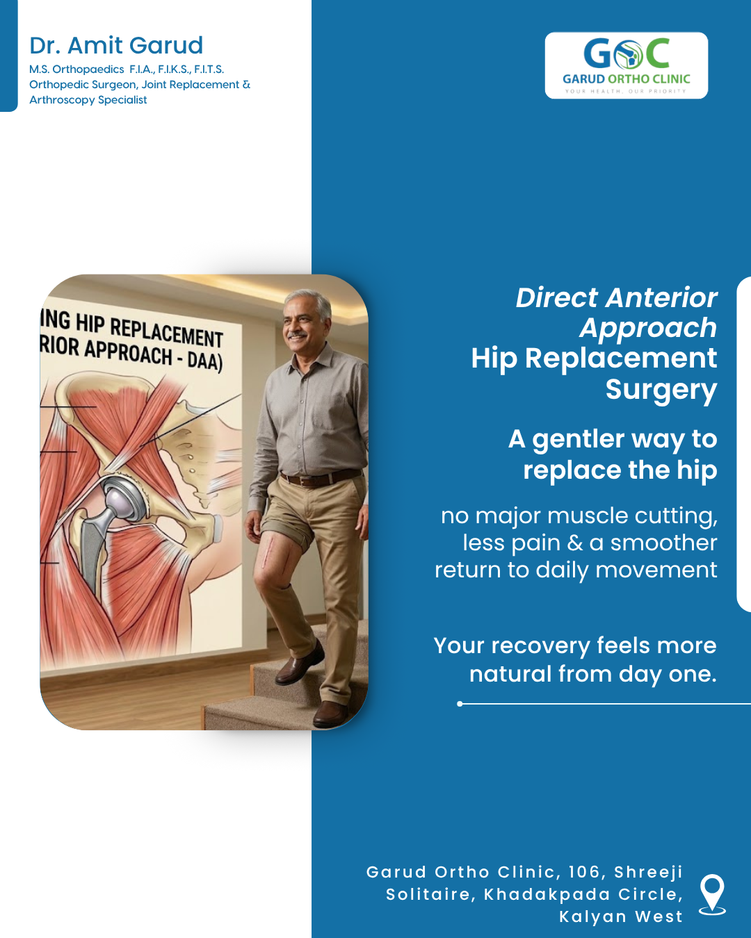 Muscle‑Sparing Hip Replacement (DAA) Gentle, Muscle‑Sparing Hip Replacement with the Direct Anterior Approach (DAA) At Dr. Amit Garud’s Orthopedic Clinic, Kalyan, we meet many patients who say, “Doctor, I’m scared of muscle cutting… will I be able to walk normally again?” With the Direct Anterior Approach (DAA), the answer is reassuring — this technique works between muscles, not through them. That means less trauma, less pain, and a smoother return to daily life. DAA is a true muscle‑sparing hip replacement, ideal for people who want to stay active, recover faster, and avoid the long downtime often associated with traditional surgery. Patients often notice they can stand and walk sooner, feel more stable, and regain confidence early in their recovery. Why patients choose DAA: No major muscle cutting Lower postoperative pain Faster mobility and independence Reduced risk of hip dislocation More natural movement early on Most searched question: “Does muscle‑sparing hip replacement really reduce pain?” Yes — for many patients, avoiding muscle cutting makes a noticeable difference in comfort and recovery. Visit Dr. Amit Garud, Orthopedic & Joint Replacement Surgeon, Kalyan, to understand if DAA is right for you.