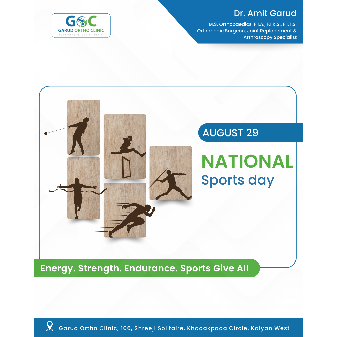 National Sports Day| August 29 - Message from Dr Amit Garud, Orthopedic, Joint Replacement Surgeon, Kalyan At Garud Ortho Clinic, Khadakpada, Kalyan, we celebrate National Sports Day in honour of the legendary Major Dhyan Chand, whose dedication to the game continues to inspire generations. Sports aren't just about competition—they’re a pathway to fitness, confidence, and lifelong bone strength. Regular physical activity improves mobility, strengthens muscles, and keeps joints healthy across all ages. 'Sports help build stronger bones and sharper minds—but listening to your body is key, ' says Dr. Amit Garud, Orthopedic & Joint Replacement Surgeon in Kalyan. 'When practiced consistently and correctly, sports can delay age-related orthopedic issues and boost overall wellness.' This August 29 let’s celebrate movement—because active lives keep you fit and healthy.