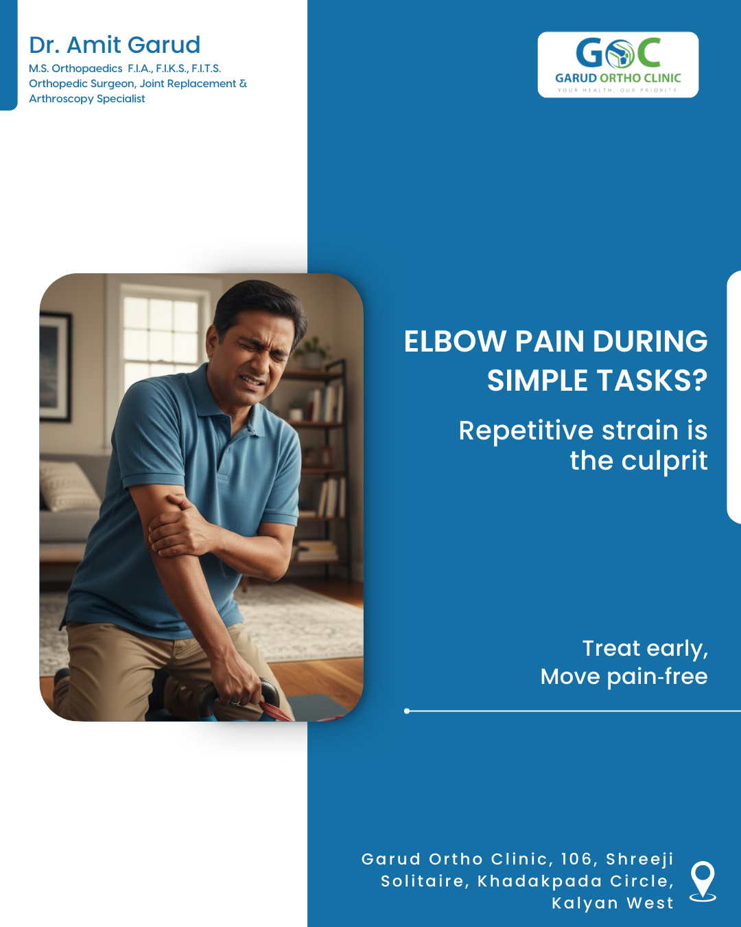 Orthopedic, Arthroscopy & Joint Replacement Surgeon in Kalyan, Dr Amit Garud, explains that tennis elbow (lateral epicondylitis) is caused by overuse of the tendons around the elbow. It affects not only athletes but also carpenters, painters, homemakers, and computer users who perform repetitive arm movements. Symptoms include: · Pain on the outer side of the elbow · Weak grip strength · Discomfort while lifting, twisting, or typing Treatment usually involves rest, ice, antiinflammatory medicines, physiotherapy, and ergonomic adjustments. Severe cases may require injections or surgical options. If elbow pain is affecting daily activities, consult your doctor for timely care.