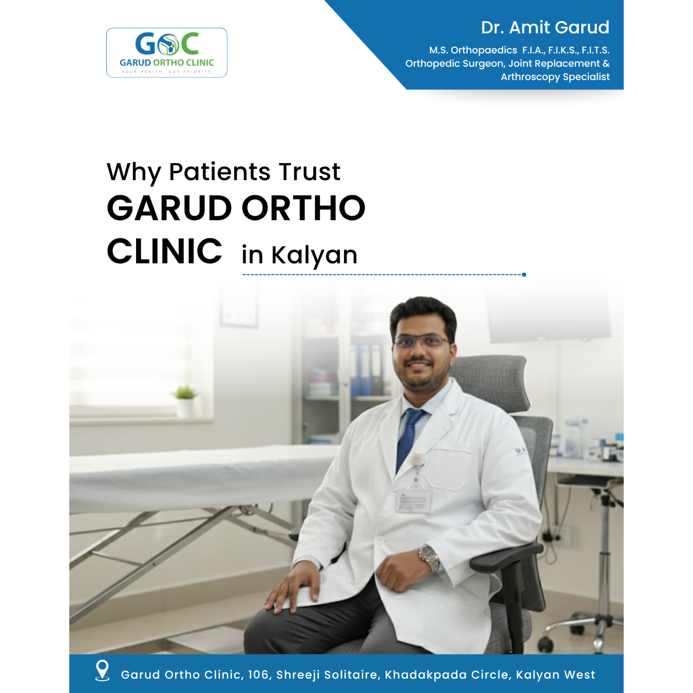 When pain limits your movement, it affects every part of your life—your work, your relationships, your peace of mind. At Garud Ortho Clinic, we understand that. That’s why patients across Kalyan and nearby suburbs trust Dr. Amit Garud for expert bone and joint care. From joint replacements to spine and sports injury treatments, we combine compassion with advanced techniques to help you recover faster and live pain-free. Conveniently located in Khadakpada, our clinic is designed for your comfort and recovery. Book your appointment today!